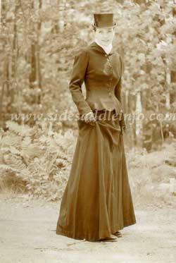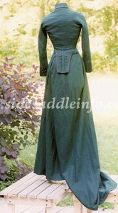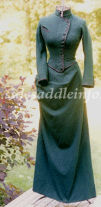 1870's/1880's The high mandarin collar, multi- button front, and stylized coat-tail, seen in French fashions as early as the 1870’s, were more typical of American habits in the 1880’s. This habit, in a very light weight bottle green wool, has 11 seams and two stays in the basque, or snugly fitted bodice.Straight legged riding trousers of matching fabric were standard under the double-knee-pocket riding skirt of the period. |
