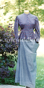 1880/1910 The shaped riding skirt was at first considered too complicated to be made at home, but by the late 1800’s fashion magazines included patterns and directions as well as illustrations. While women who rode did so in a sidesaddle, not all needed or could afford a tailored habit. This riding skirt in denim, a sturdy fabric that had been used in work clothes for over 100 years, was a rural woman’s practical alternative. |