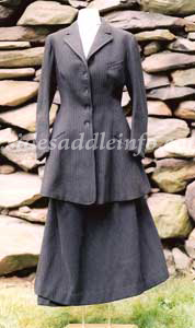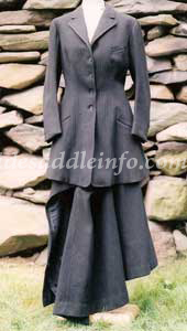 1910-1915 A heavy melton wool habit by Deggerberg of Philadelphia, PA, features the long, princess style coat popular in the Edwardian era. Its shaped riding skirt, following a movement that began around 1885, has evolved into a single-knee-pocket style known as the half apron skirt. When buttoned up for walking, its “new” safety feature--a cut out area under the right leg intended to prevent the skirt from catching on pommels--is concealed from prying eyes. |